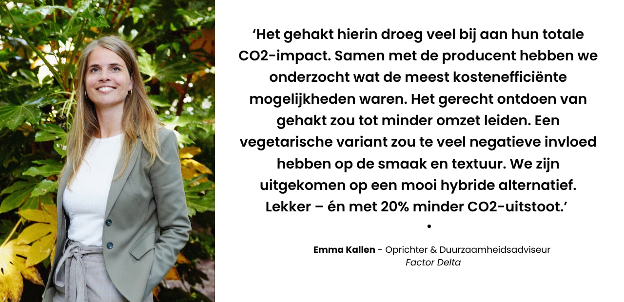 Een voorbeeld uit de praktijk: een producent van kant-en-klaarmaaltijden had spaghetti bolognese als populairste gerecht. Het rundvlees in de saus was een grote uitstootbron. Een volledig vegetarische variant werkte niet qua smaakbeleving. Maar een hybride recept (gedeeltelijk plantaardig) bleek: