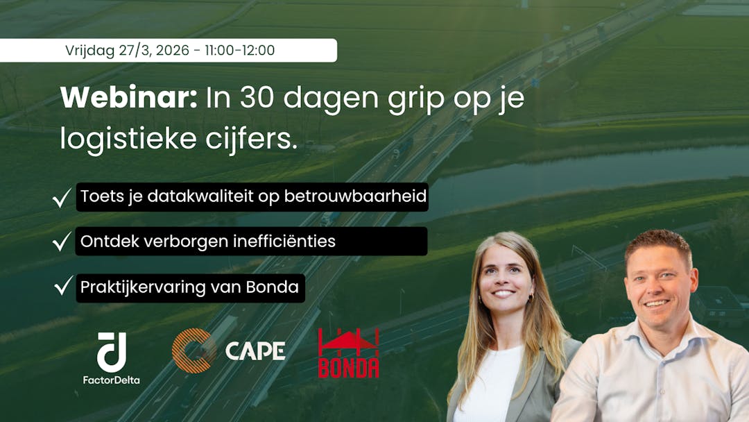 Factor Delta is partner voor stap 1, 3 en 4 in het programma: We ondersteunen jou bij het op orde krijgen van je gehele datakwaliteit - inclusief het meten en rapporteren van je eerste CO₂-jaarrapportage, tot het structureel verbeteren van je processen en samenwerking met klanten, leveranciers en (collega-)transporteurs.